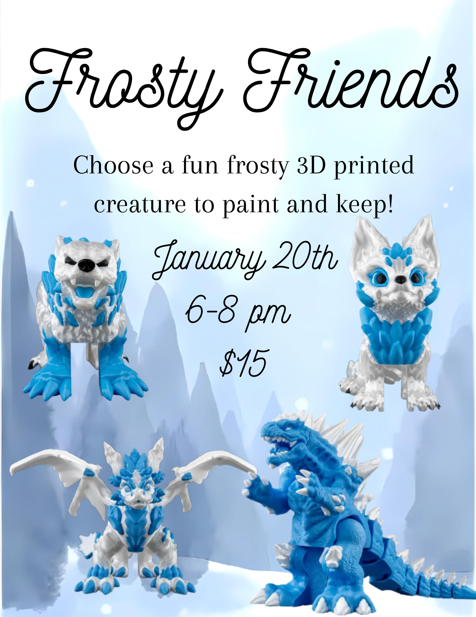 Choose a fun frosty 3D printed creature to paint and keep! Choose between ice bear, artic fox, ice dragon or icy godzilla monster!